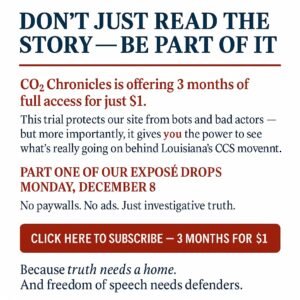 We don’t have corporate sponsors or political backers—just readers like you who believe the truth still matters. CO₂ Chronicles exists because Louisiana deserves watchdogs who can’t be bought and stories that can’t be silenced. If our reporting speaks to you, help us keep digging. Subscribe, share, and stand with us as we shine light where power prefers darkness.